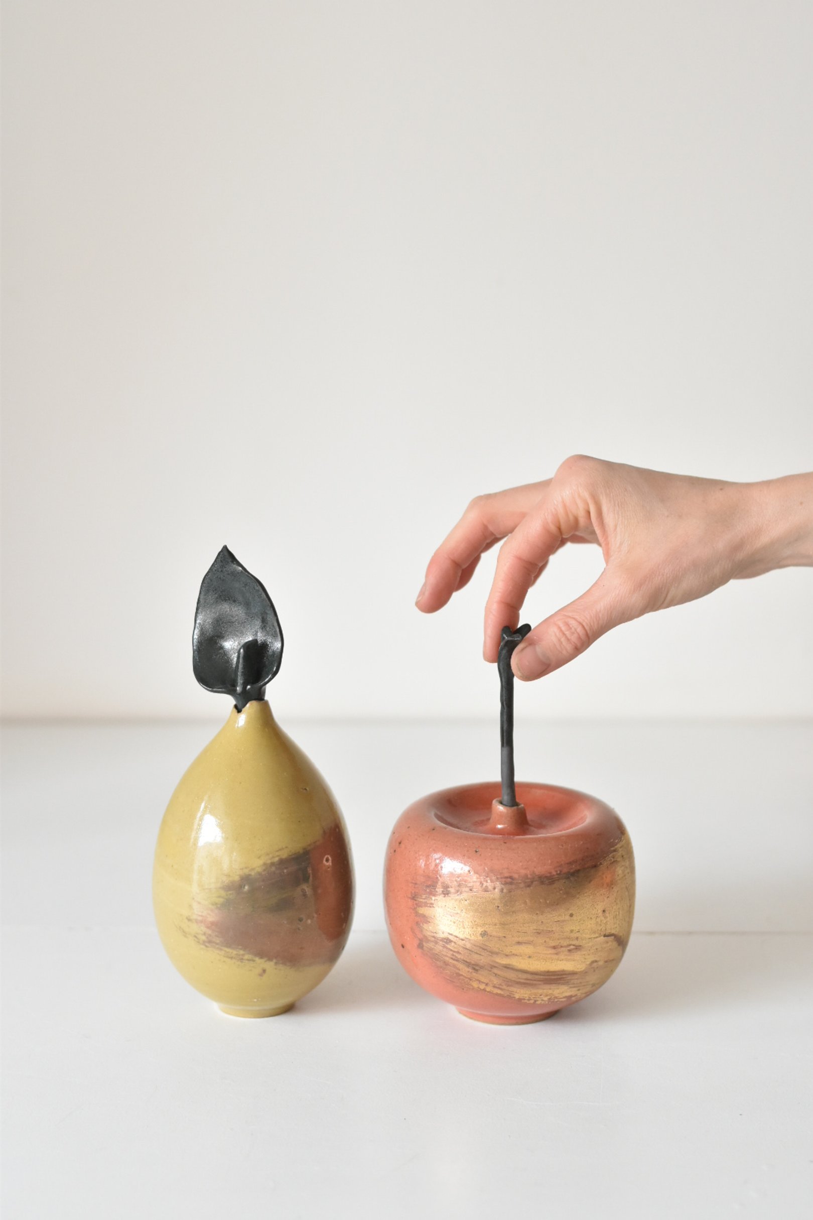 The apple is made of two parts. The bottom part can be used as a vase. It’s made of a mixed stoneware. It’s glazed warm light red inside and out. It has a golden brushstroke the body. The top part is small decorative stick with a leave. It’s made of dark brown stoneware glazed dark green.